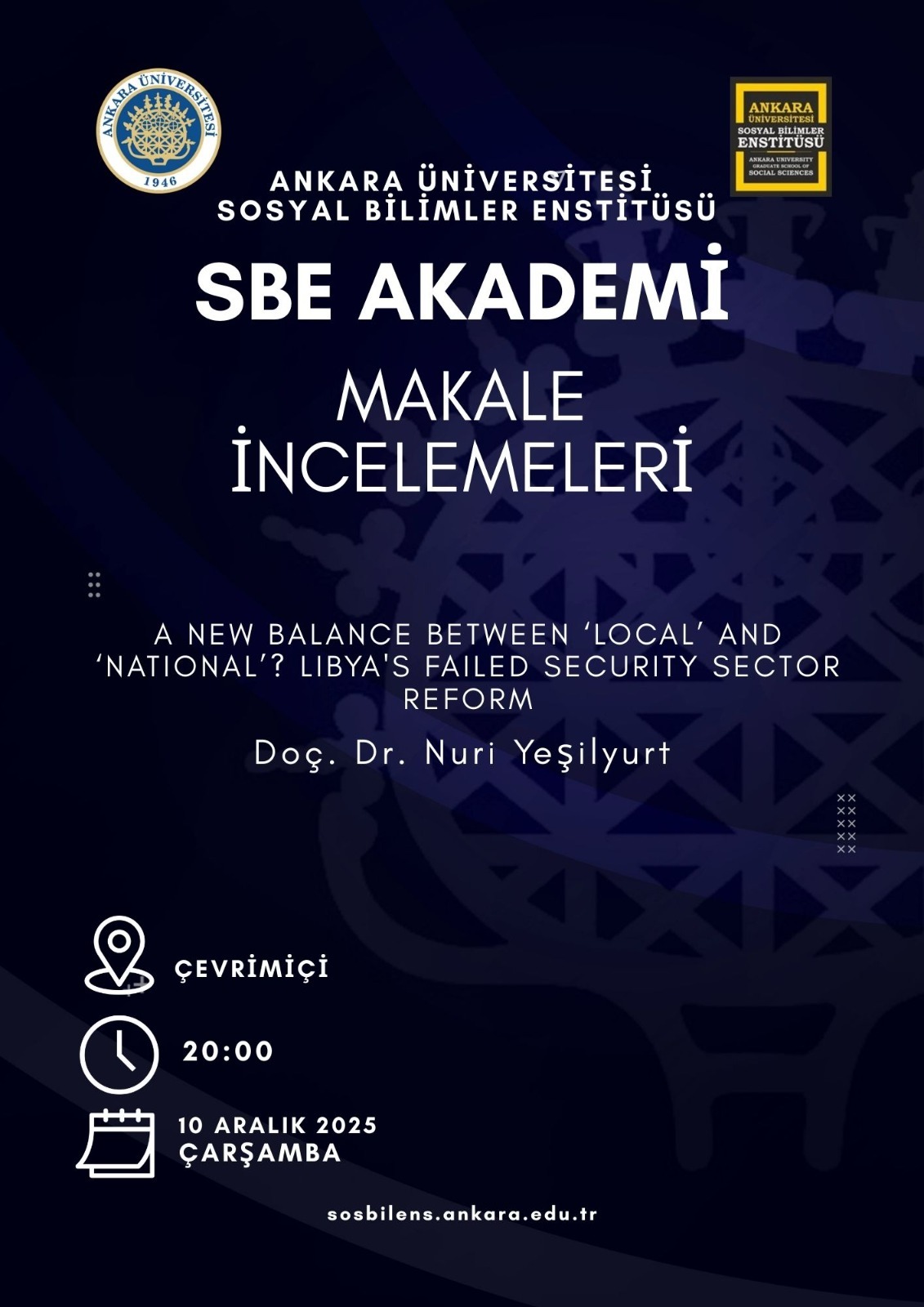 Akademi’de Doç. Dr. Nuri Yeşildağ Makale İncelemeleri kapsamında “A New Balance Between ‘Local’ and ‘National’? Libya’s Failed Security Sector Reform” konulu bir seminer verecek. Seminer yüksek lisans ve doktora öğrencileri için düzenleniyor. Toplantıya katılmak için bağlantıya tıklayınız.