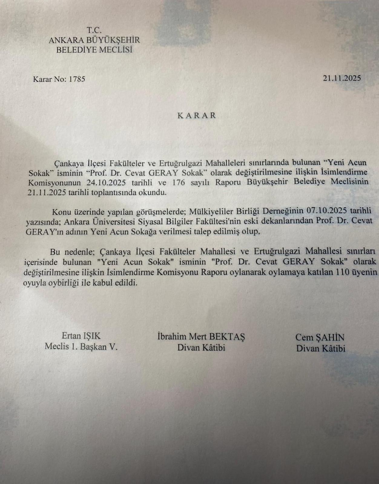 Ankara Büyükşehir Belediye Meclisi 21 Kasım 2025’teki toplantısında oybirliğiyle aldığı kararla talebimizi kabul etti ve “Prof. Dr. Cevat Geray Sokak” tabelası Cebeci’de yerini aldı.